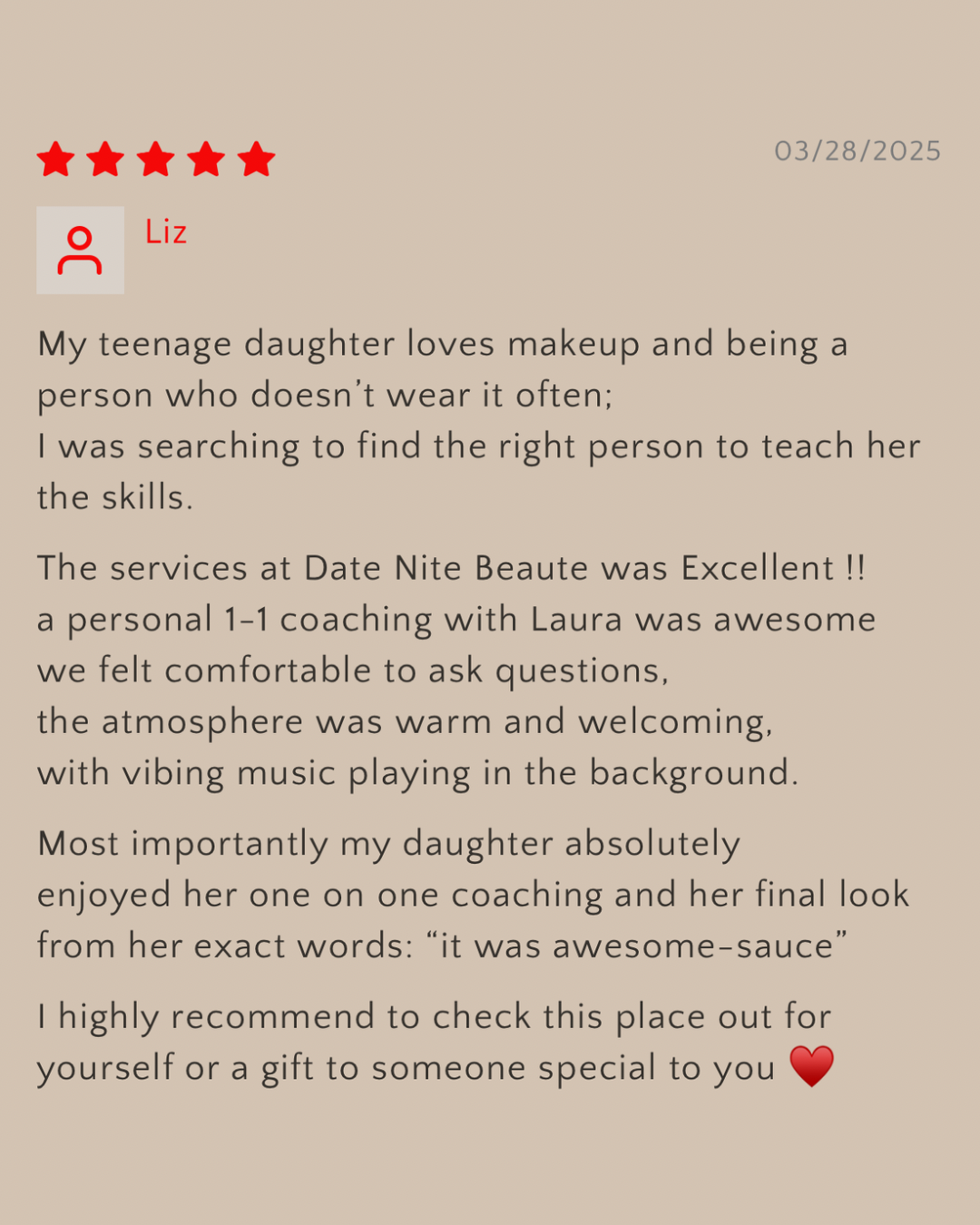My 14 year old was so excited to get her own beauty consultation! Laura took her time to understand my daughter’s wants & needs, as well as make her feel comfortable throughout it all. My daughter left feeling more confident in her makeup skills and she was so excited to leave with goodies to practice! I’m so happy I booked this appointment for her and now I’m looking forward to mines! I highly recommended Laura’s expertise and advise!